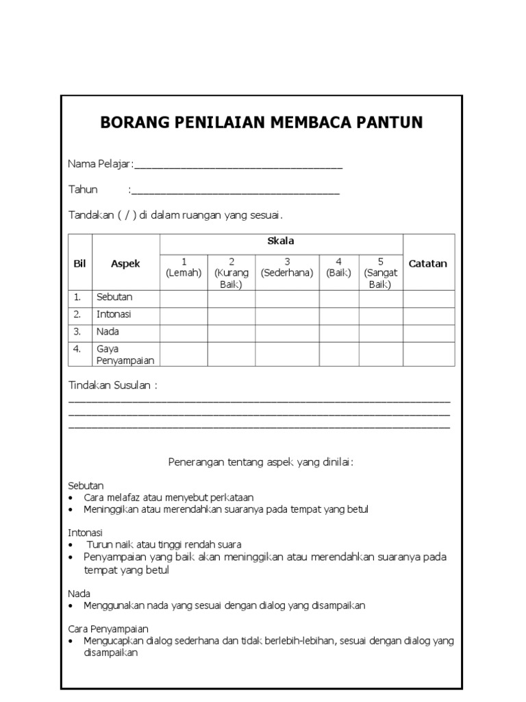 Format Penilaian Membaca / Teknik Dan Instrumen Penilaian Kurikulum 2013 Tingkat Sd Mi Revisi 2018 Sanjayaops - Kinesik yaitu gerak anggota tubuh.. 37 full pdfs related to this paper. Kriteria penilaian lomba menulis puisi aspek kriteria dan skor 25 20 15 10 kelengkapan aspek formal puisi memuat 1 judul 2 pengarang 3 tipogafi bait dan larik 4 titimangsa penulisan hanya memuat tiga subaspek hanya memuat dua subaspek hanya memuat satu subaspek bobot. Format penilaian membaca al quran. Kemampuan membaca intensif adalah kemampuan memahami detail secara akurat, lengkap dan kritis terhadap fakta, konsep, gagasan, pendapat, pengalaman, pesan dan perasaan yang ada pada wacana tulis. Kriteria dalam setiap lomba tidak semua sama.