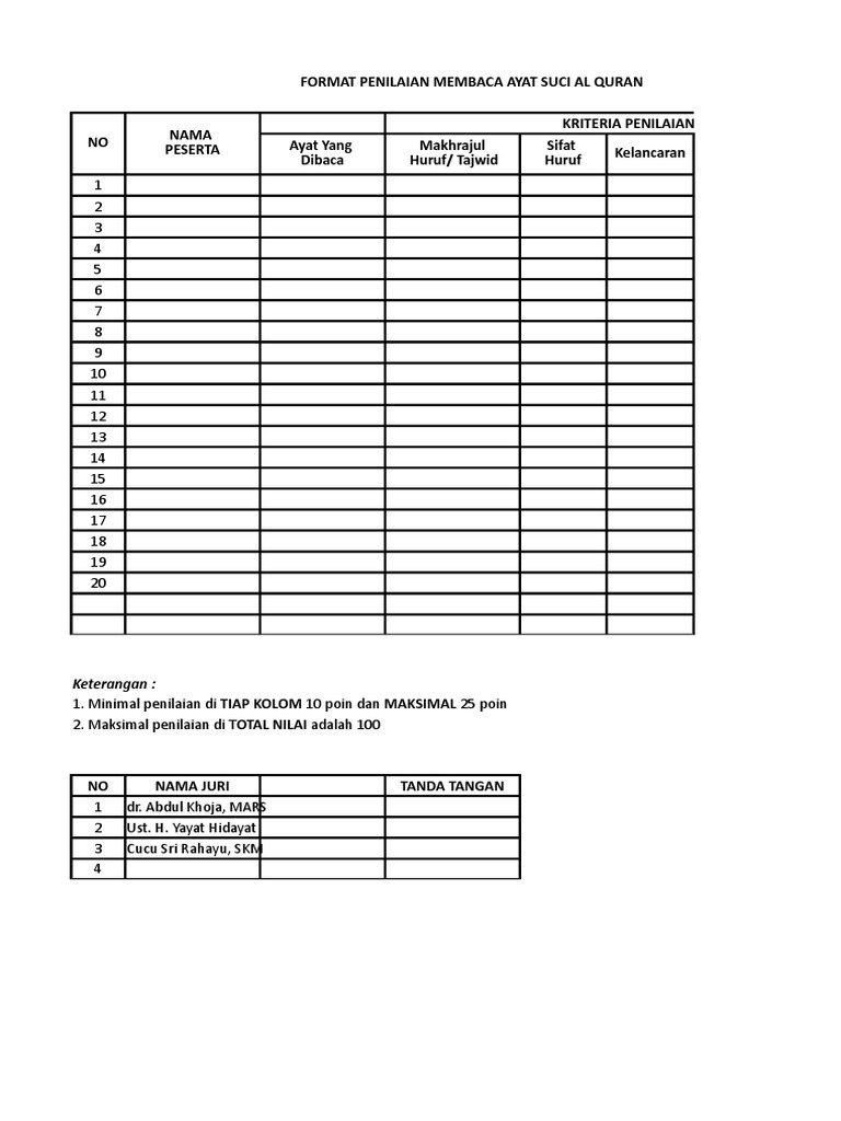 Format Penilaian Lomba Mtq Contoh Blangko Nilai Pontren Com from live.staticflickr.com Kriteria penilaian lomba menulis puisi aspek kriteria dan skor 25 20 15 10 kelengkapan aspek formal puisi memuat 1 judul 2 pengarang 3 tipogafi bait dan larik 4 titimangsa penulisan hanya memuat tiga subaspek hanya memuat dua subaspek hanya memuat satu subaspek bobot. Kriteria dalam setiap lomba tidak semua sama. Kinesik yaitu gerak anggota tubuh. Ekpresi adalah pernyataan perasaan hasil penjiwaan puisi. Dec 25, 2009 · penilaian pembelajaran membaca. Aug 06, 2020 · contoh format penilaian lomba membaca puisi kriteria penilaian lomba membaca puisi sejuta warna blog tentang bacaan al quran doa doa tata cara ibadah contoh surat makalah skripsi. Apakah membaca merupakan definisi paling benar? 37 full pdfs related to this paper.
